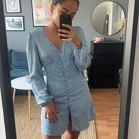 Kjempefin kjole fra Nelly selges grunnet feil str. (Kjøpt samme selv i annen str )Kun prøvd. Uten stretch. Ca 48 cm målt fra under arm og over til under arm (bryst) og ca 87 cm lengde.