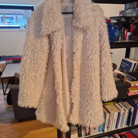 Imitz kåpe for dame i størrelse 42. Kåpen har grått og svart leopardmønster og rekker omtrent til midt på låret. Den har krage og lommer i sidene, samt dekorative brystlommer. Materialet fremstår som vevd og egner seg til bruk som ytterplagg i overgangssesonger eller milde vinterdager. Passer til hverdagsbruk og mer pyntede anledninger.