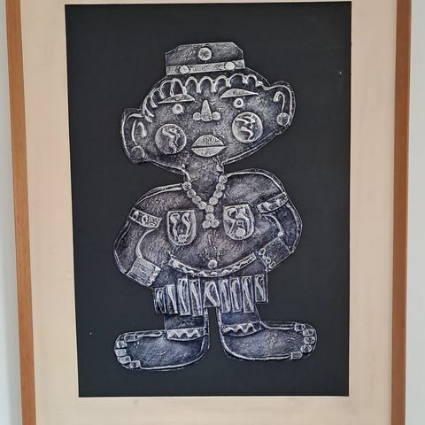 Kunst av finn nipen.☘️Utrolig stilig. Er Noe fuktskader kun på selve rammen. Kunstfiguren er hel og fin. Selve mannen Er lagd av metall. Selges til hbo 1200kr. Er ett orginal bilde, one of a kind. 🤗🍀