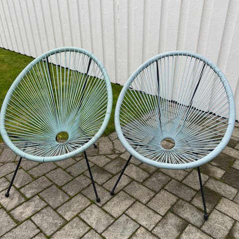 Selger samla 4 fine plaststoler. Har stått under tak når de ikke ble brukt. Selger med pent brukte grønne puter. Selges for 350,- pr stk med pute.