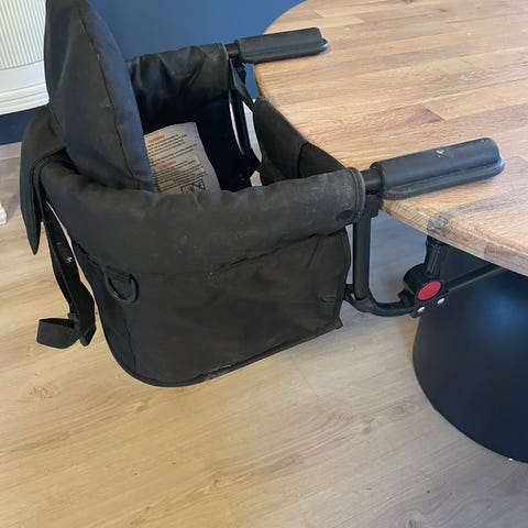 Genial stol til hjem og reise. Enkel og pakke sammen og passer de fleste bord. Trekket er nyvasket.