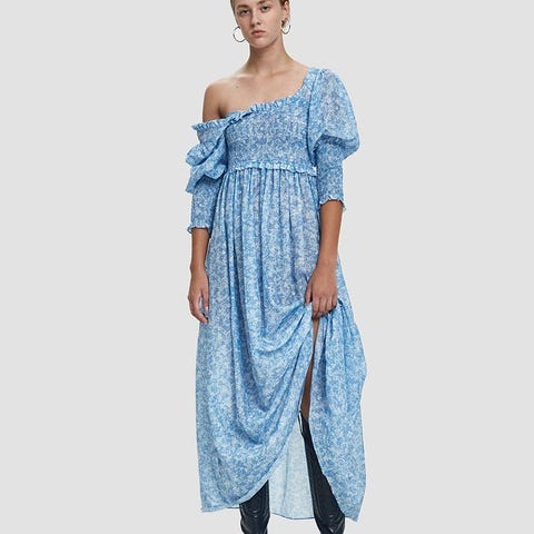 Nydelig blå kjole med blonde broderi med rund hals og knappestolpe i front. Kjolen har innvendig stroppekjole, 3/4 lange ermer med mansjett og knapp og kappeskjørt med vidde. Må hentes i trondheim.