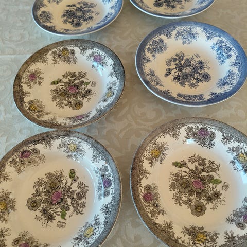Dekoren på to av asjettene skiller seg litt fra de øvrige fem, men ikke så mye