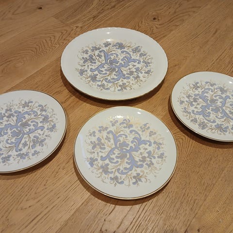 1.) Et fat, ev pyntefat i fin stand uten skader. Ø ca 23,5cm. Blankt og fint uten gullslitasje.