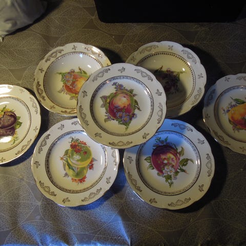 6 dessertskåler (2 ubetydelig krakelerte) D:17,5 cm kr. 600,-