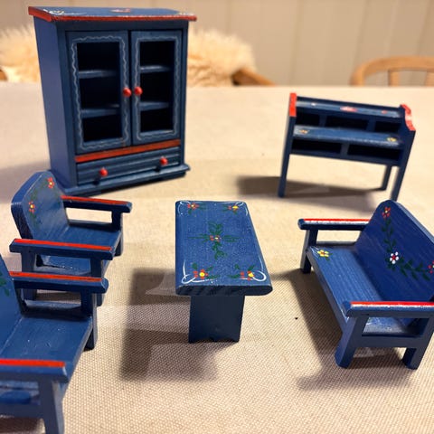 Vintage dukkehusmøbler. Møblene er som nye, kun stått til pynt Antakelig fra 60-tallet. Bordet er ca. 8 cm bredt, skapet 17 cm høyt. Møbler for samlere. Selges samlet for 450,- , eller enkeltdeler etter avtale. Kan hentes eller sendes mot porto. (Lille dukken er solgt)