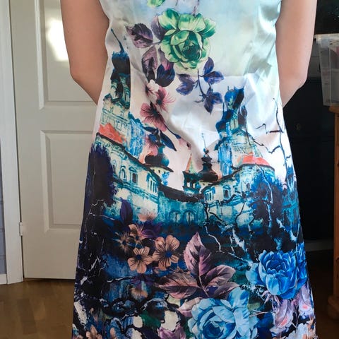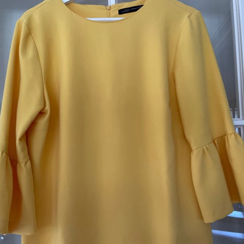 Kun prøvd på, men lappen er tatt av. Gulfargen på bildene er sterkere enn i virkeligheten. Lukkes med usynlig glidelås i siden og har fastsydd underkjole