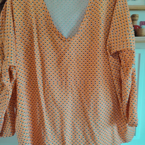 Karamell-farget bluse som svinger inn i midjen. Fin detaljer på krage og håndledd som er foldet over. Kommer fra et røykfritt hjem.
