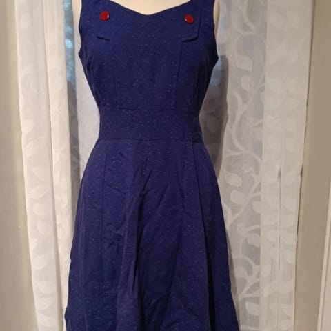 Frisk og stilren kjole sydd etter Vogue 50-tallsmønster og tilpasset noe. Fullt sirkelskjørt. Kjempefint når man danser. Kjolen er sydd i bomull og foret og det kan følge med tyllskjørt mot et tillegg i prisen. Bildene er tatt uten tyllskjørt. Det er godt med sømrom til å sy ut og kjolen kan selvfølgelig legges inn.