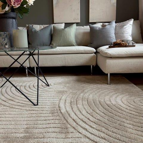 Ryeteppe i fargen Champagne fra Homeroom i beige. Kjøpt for kr 3999. Har hatt det på soverommet og det har gitt god varme på et kaldt gulv om vinteren!