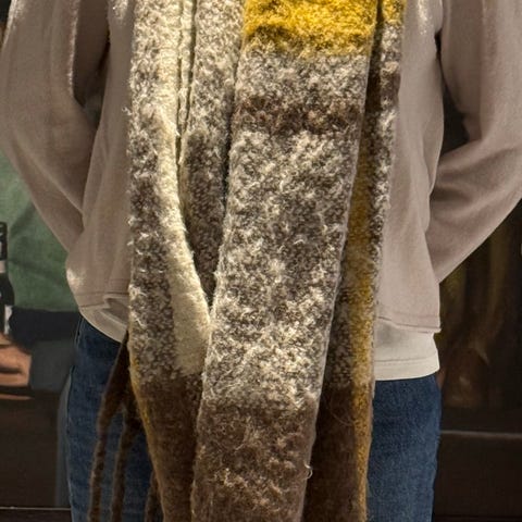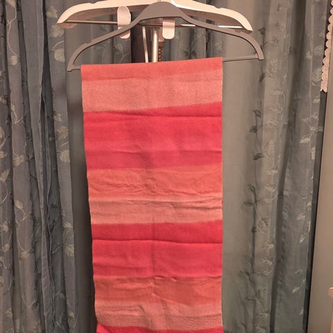 Varmt og dekorativt rosa skjerf fra Friis company. Dekorativ strikk med mønster.