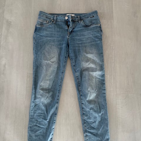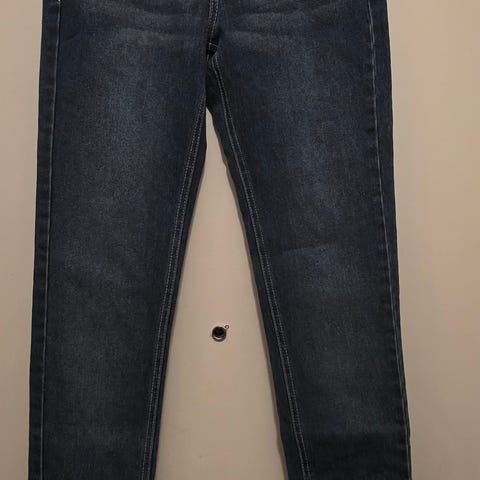 Blå, med mye stretch, pyntelommer foran, vanlige baklommer