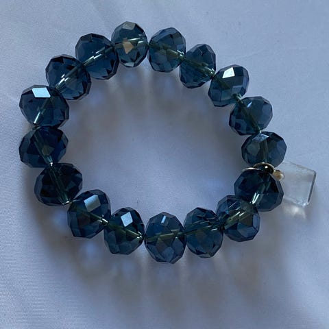 Kjede med ujevne perler i blågrå toner, selges kr 100,- pluss frakt.