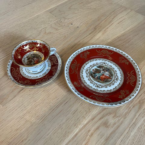 Selger disse fire fine gamle mocca settene av kopp,skål og asjett.