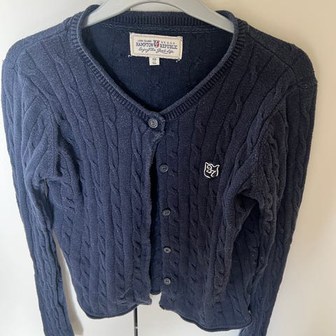 Marineblå cardigan i str. 8/128. Litt usikker på80 % wool og 20 % nylon. Litt usikker på om denne har blitt brukt.