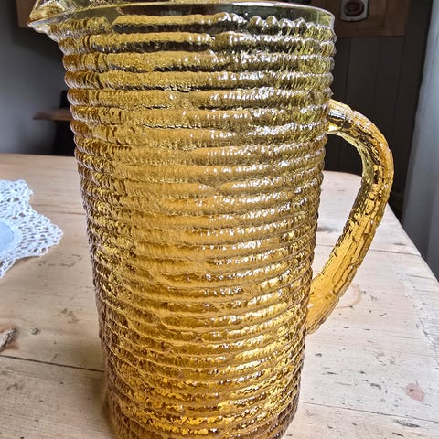 Nydelig pressglasskanne. Feilfri og tung. Meget vakker som dekor, eller som vase etc. Rommer ca 1.5 dl. Høyde 14cm.