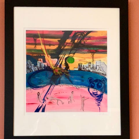 Vakkert håndkolorert maleri av kunstneren Vlekart. Hvit ramme med kunstglass.