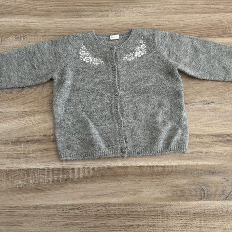 Pent brukt jakke i bomull med søte detaljer. Den lyserosa cardiganen er strikket.
