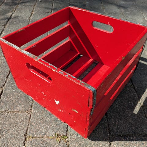 Selger ulike gamle trekasser fra gammelt gartneri.