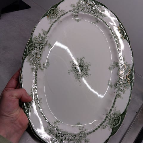 Fatet er i god stand uten om at det har gått av en bit av skallet, det påvirker ikke hvordan det står på bordet og da syntes det heller ikke.
