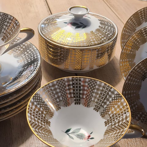 Kopp, H:6,75 cm, D:7 cm, skål, asjett, 10 av hver, sukkerkopp med lokk, fløtemugge, melkemugge, kaffekanne.