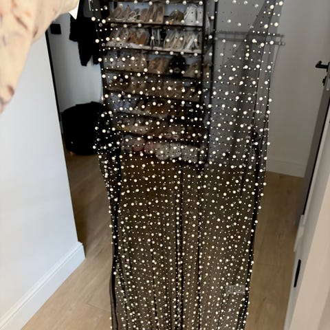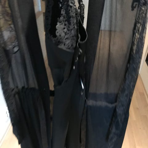 Halterneck og delvis åpning i rygg. Det må syes/forsterkes hempen bak som holder knappene på. (Se bilder) kjolen har litt tyngde pga perlene, men ikke mye.