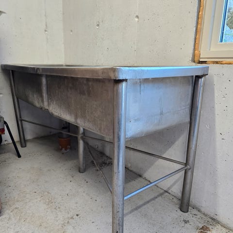 Vasken er ca 115 cm bred, 63 cm dyp på toppen, og 86 cm høy. Selve dybden/innvendig høyde på kummene er 46 cm fra sluket og opp til kanten.