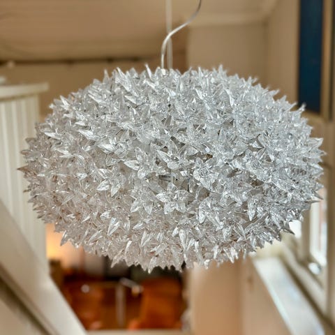 FL/Y fra Kartell. En lampe som passer inn i alle miljøer takket være sin enkle form og mange farger. Den store energisparepæren blir en del av designen samtidig som den gir maksimalt med lys. Leveres med lyskilde. Strømledningen er av transparent plast, takkoppen kommer i samme farge som lampeskjermen.