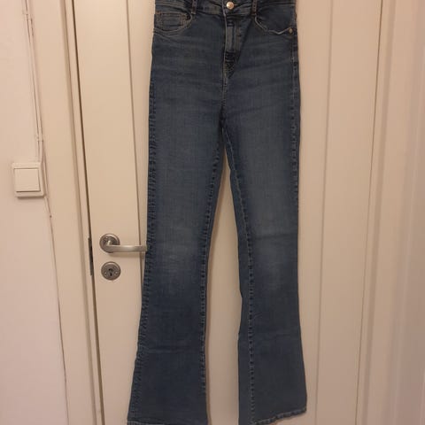 Selger en pent og lite brukt dongeribukse / jeans fra BIK BOK. Str. S. Never Denim. Dette er en 5-lommersjeans av vasket denim med tettsittende fasong. Den har bootcut og god stretch, gylf med knapp og glidelås. Se bilder for nærmere detaljer.