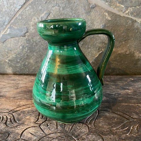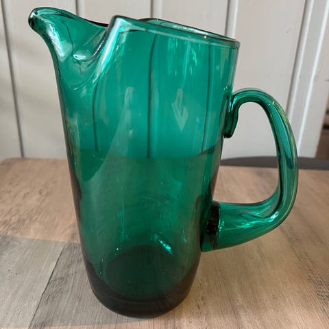 Morsom retro vinkaraffel i grønt glass og flettet kurs. I god stand - kun mindre bruksmerker. Karaffelen er 28 cm høy.