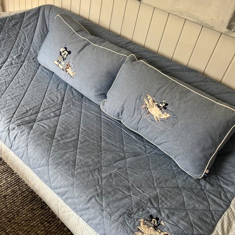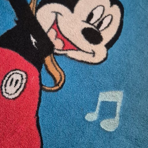 Small World sengeteppe med Mikke Mus mønster, str. ca. 220 x 130 cm. Vendbart. I fin stand uten skade eller slitasje. Selges til 300 kroner.