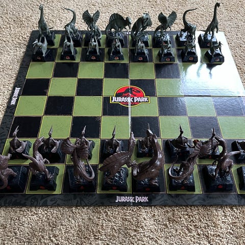 Komplett med 32 fint skulpturerte brikker og fullt grafisk sjakkbrett, vil dette sjakksettet frakte deg rett inn på øya hvor dinosaurene regjerer! Kongen er selvfølgelig en Tyrannosaurus Rex, Dronningen en Spinosaurus, Løpere er Dilofosaurer, Springere er Velociraptorer, Tårn er Brachiosaurer og bønder representert av Pteranodons. Moro for dinosaurelskere i alle aldre! Sjakkbrikkene måler 5 til 10 cm. Spillebrettet er 48 x 48 cm.