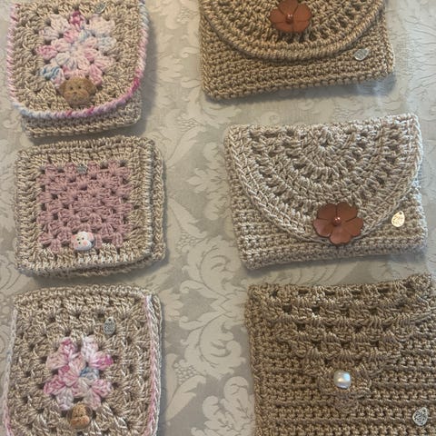 Liten veske/mappe for beskyttelse av nettbrett. Sydd i demin, vattert og foret. Søt heklet detalj på forsiden. Knapp for lukking.