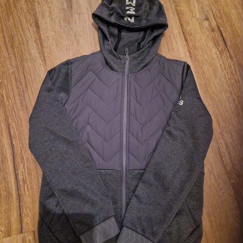 Oransje jakke som «lyser», litt som refleks. Passer bra til barn, sport på vinteren da det er lett å se de når det er mørkt ute.