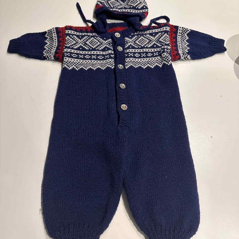 Ny hjemmestrikket mariusdress str 2 år. Komplett med lue, votter og sokker. Bunnfargen er lyseblå. Strikket i Lanett 100% merinoull. Kan sendes mot porto