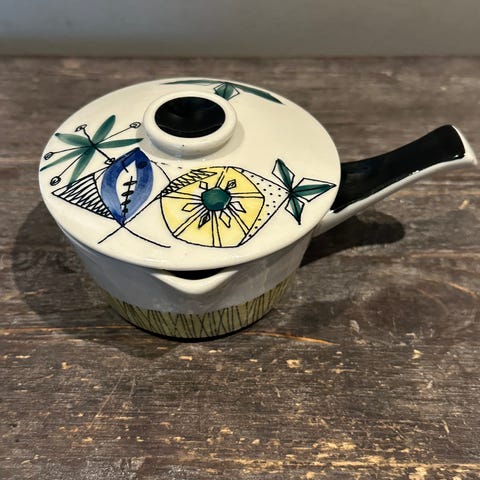 StavangerFlint Flamingo, Ildfast form med lokk. Er brukt og bærer preg av litt slitasje i lakken. Men ingen krakellering eller skår hverken på lokk eller form.