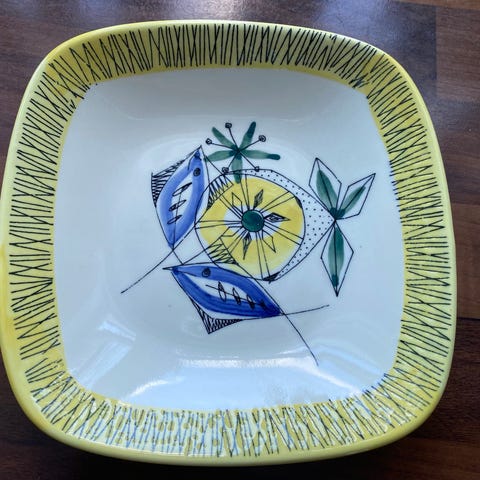 23,5x19,5 cm 3,5 cm høy. Hel og greit. Ingen krakellering eller skår. Noen bruksmerker.