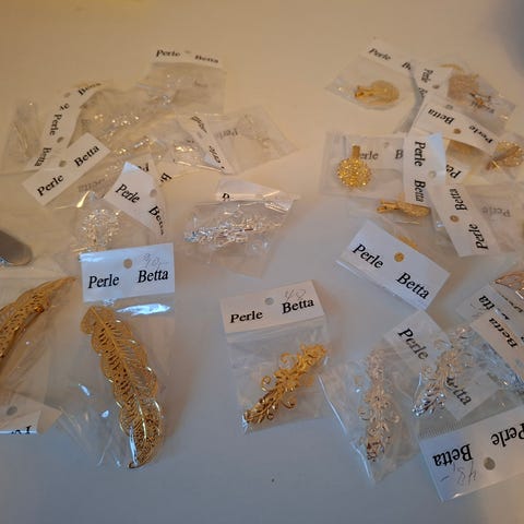 Lager smykker. Halsbånd med skinnrem med lås og øredobber. 70 kr pr + porto. Har sommerfugler med bling i mange farger. 80 kr på sølvbånd