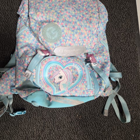 Beckmann sekk til bruk på skole selges. Rosa og pastellfarger med enhjørning. Mangler en stropp og en spenne er knekt. Rom for læringsbrett og små sidelommer. Passer nok best for bruk i ca 1-3/4 klasse.