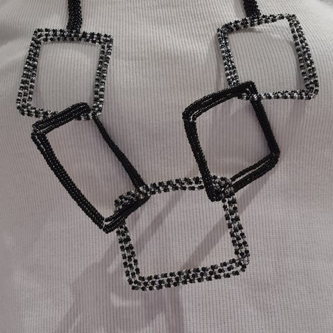 Nydelig gullfarget lag-på-lag halskjede med små flerfargede perler og anheng. Lite brukt.