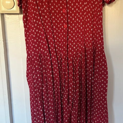 Pen kjole i 100% viskose, ankellengde. Knapper i tre langs hele lengden. Selges pga litt for trang for meg. Er nok en str 42. Kan sendes.