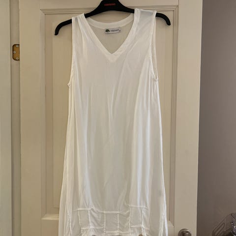 Maskinstrikket topp i tynt garn som ikke klør. Har klippet bort merket i nakken da det klødde, men tipper det et M.