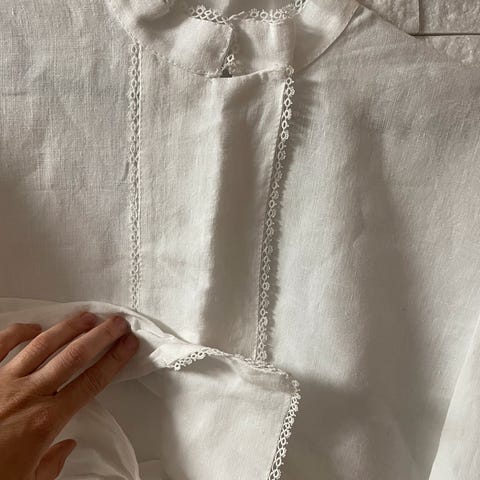 Hvit kalket bluse topp med noe batikk fra livet og opp. Fine detaljer ende armer og i front. PS noen perler er rammet av men ser ok ut. Pent brukt. Original ord pris 3500