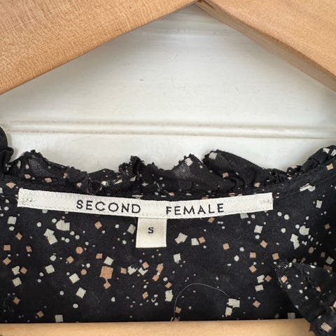 Topp, JACQUELINE de YOUNG, str 34, (36), sort med små offwhte stjerner & prikker. Krøllfri. . Lite brukt. Veldig stilig topp til både bukse og skjørt. Selges kr 50,- Hentes sentralt Tromsø.