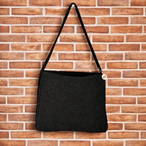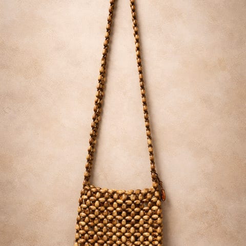 Disse veskene er igjen fra nettbutikken min. Denne er laget av treperler og har målene 20cmx20cm. Høyden fra toppen av stroppen og ned til vesken er 56cm. Lang nok til å bruke som cross body.