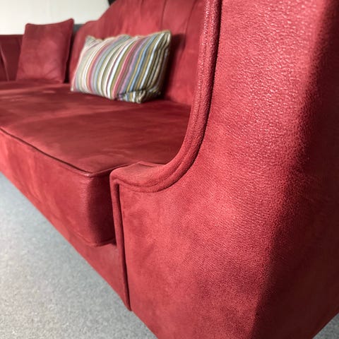 Rødt ullstoff med gult/grønt mønster og grønne snorer.