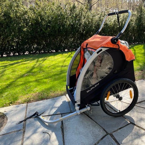 Sykkeltilhenger som kan brukes som barnevogn med 2 seter og bagasjerom