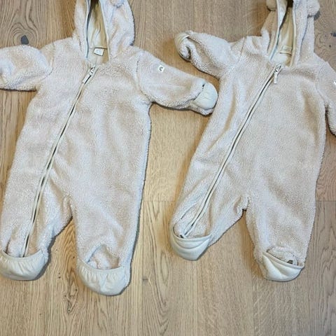 Nesten ubrukt dress. Str 62 - 2-6 mnd. Brukt av våre tvillinger, gode og myke - holder godt på varmen. Kr 350,- pr stk. Kan sendes mot porto.