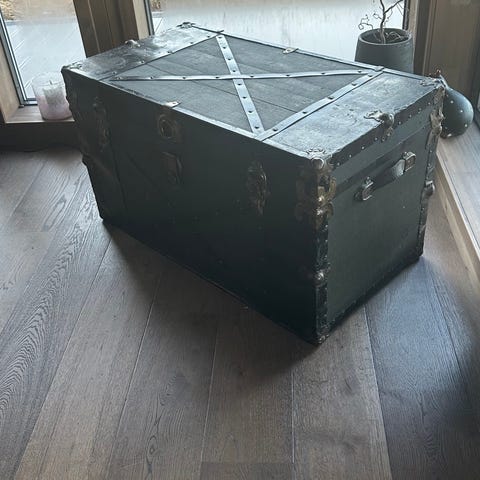 Gammel amerikakoffert/reisekiste selges. I god stand, oppbevart tørt innendørs. Trekiste malt i flott mørk grønnfarge. Fine detaljer i svart messing.