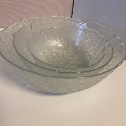 bladformet skål laget av gjennomsiktig glass. Skålen har et detaljert bladdesign som gir et unikt utseende. Egnet for servering av salater, frukt eller som dekorasjon.